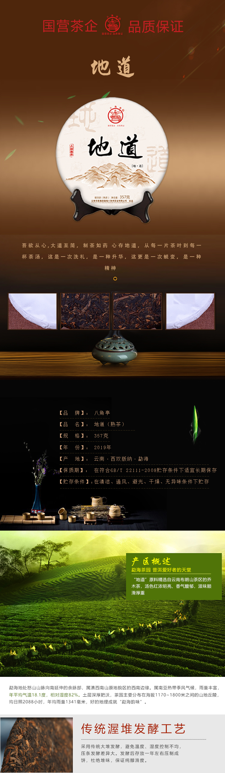 云墾茶業(yè)集團下屬茶葉生產企業(yè)——云南農墾集團勐海八角亭茶業(yè)有限公司原名黎明茶廠,是我國歷史最為悠久的茶企之一,曾位列“中國普洱茶十大知名品牌”“十大最受歡迎茶葉品牌”、“中國普洱茶十大暢銷品牌”中,成為今天市場上最有影響力的品牌之一。公司產品獲得“綠色食品”、ISO9001、 HACCP和云茶品牌(YC)4項認證,連續(xù)獲得“云南名牌農產品”“云南名牌產品”“云南省著名商標”等品牌榮譽,公司生產的多款普洱茶在歷次專業(yè)評比中多次獲得特等金獎和金獎。在2018第五屆中國企業(yè)五星品牌論壇上,云南農墾集團勐海八角亭茶業(yè)有限公司上榜中國普洱茶行業(yè)影響力品牌——“金芽獎”,公司負責人陳勝軍先生獲“陸羽獎”,被授予2017“國際十大杰出茶人”榮譽稱號。